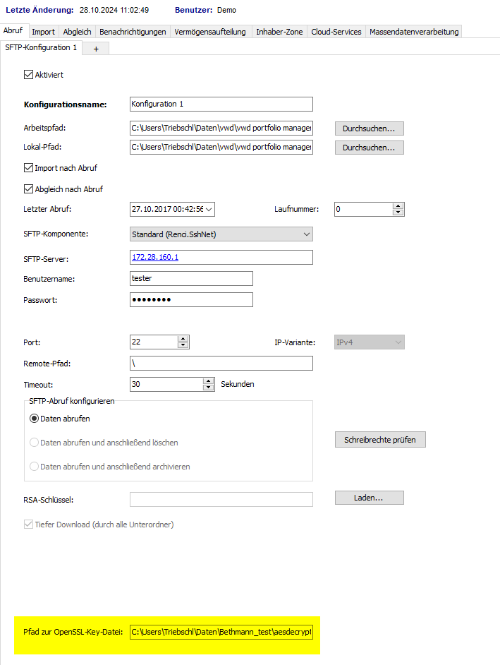 PI-8034 PI-8035 PI-8036 | I | Abruf und Import der Daten kann nun automatisiert erfolgen. Dazu können die verschlüsselt gelieferten Daten per OpenSSL entschlüsselt werden. Mit dem Update auf PSI 6.62.1 und Infront Portfolio Manager 6.62 wird die aktuelle Version von OpenSSL installiert. In den Einstellungen der Schnittstelle im PSI finden Sie auf der Registerkarte "Abruf", "SFTP-Konfiguration" nun einen Pfad zur Eingabe der OpenSSL-Key-Datei. Die Schlüsseldatei muss dabei gemäß dem Namensschema <customer name>_datakey.txt (z. B. ABC_datakey.txt für Kunde "ABC") benannt sein. ![]() Darüber hinaus haben Sie auch die Möglichkeit, einen individuellen Pfad zu einer OpenSSL-Anwendung einzugeben. Beachten Sie dazu die Ausführungen im Abschnitt Allgemeine neue Features und Verbesserungen in Update 6.62.1. |
