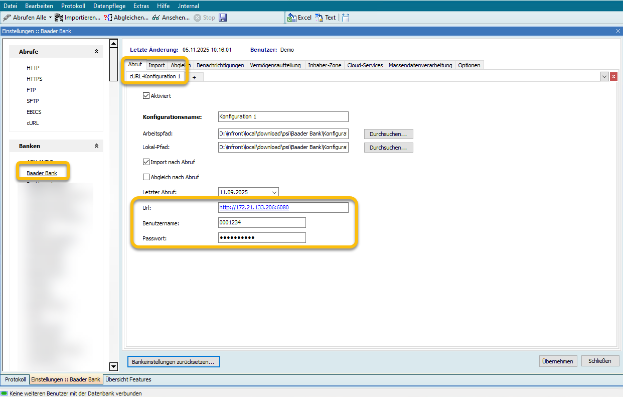 PI-8134 PI-8138 PI-8139 PI-8148 PI-8151 | I | Für das PSI Transaction Data Baader Bank wurde der Abruf auf cURL geändert. In den Einstellungen des PSI für diese Schnittstelle finden Sie auf der Registerkarte "Abruf" in der Konfiguration nun entsprechend die neuen Eingabefelder für die URL sowie Benutzername und Passwort. ![]() |