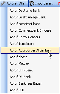 Haben Sie mehrere Portfolio Sync Interfaces zu verschiedenen Banken und möchten nur die Daten einer Bank abrufen, so klicken Sie auf den kleinen Pfeil rechts im Button "Abrufen Alle" und wählen Sie aus der aufklappenden Liste der installierten PSI die betreffende Bank aus:
