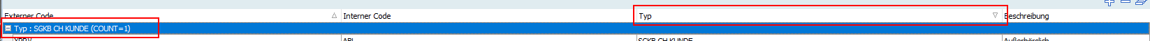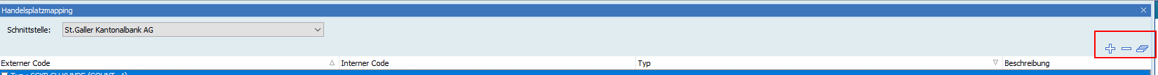 | Wählen Sie das Icon "Eintrag hinzufügen", um eine Zeile hinzuzufügen. Beim ersten Eintrag wird ein neuer Typ – z. B. "XYZ-Bank Kunde" – angelegt. Geben Sie in den Spalten "Externer Code" und "Interner Code" die gewünschten Kürzel ein. In der Spalte "Beschreibung" können Sie ergänzende Informationen zum Handelsplatz hinterlegen.