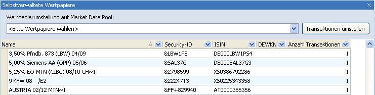 Selbstverwaltete Wertpapiere können Sie mit dem Market Data Pool Check mit den über Market Data Pool in die Datenbank aufgenommenen anhand von Wertpapier-ID und/oder ISIN vergleichen und ggf. die (importierten) Transaktionen auf diese umstellen. Das ist insbesondere in den Fällen sinnvoll, in denen Sie Wertpapiere manuell angelegt haben, die erst danach in Market Data Pool Aufnahme gefunden haben bzw. von Ihnen abonniert werden.
