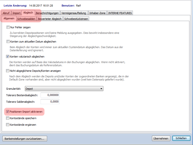 - Wählen Sie in den Einstellungen Ihrer Bank die Registerkarte "Abgleich", "Allgemein".