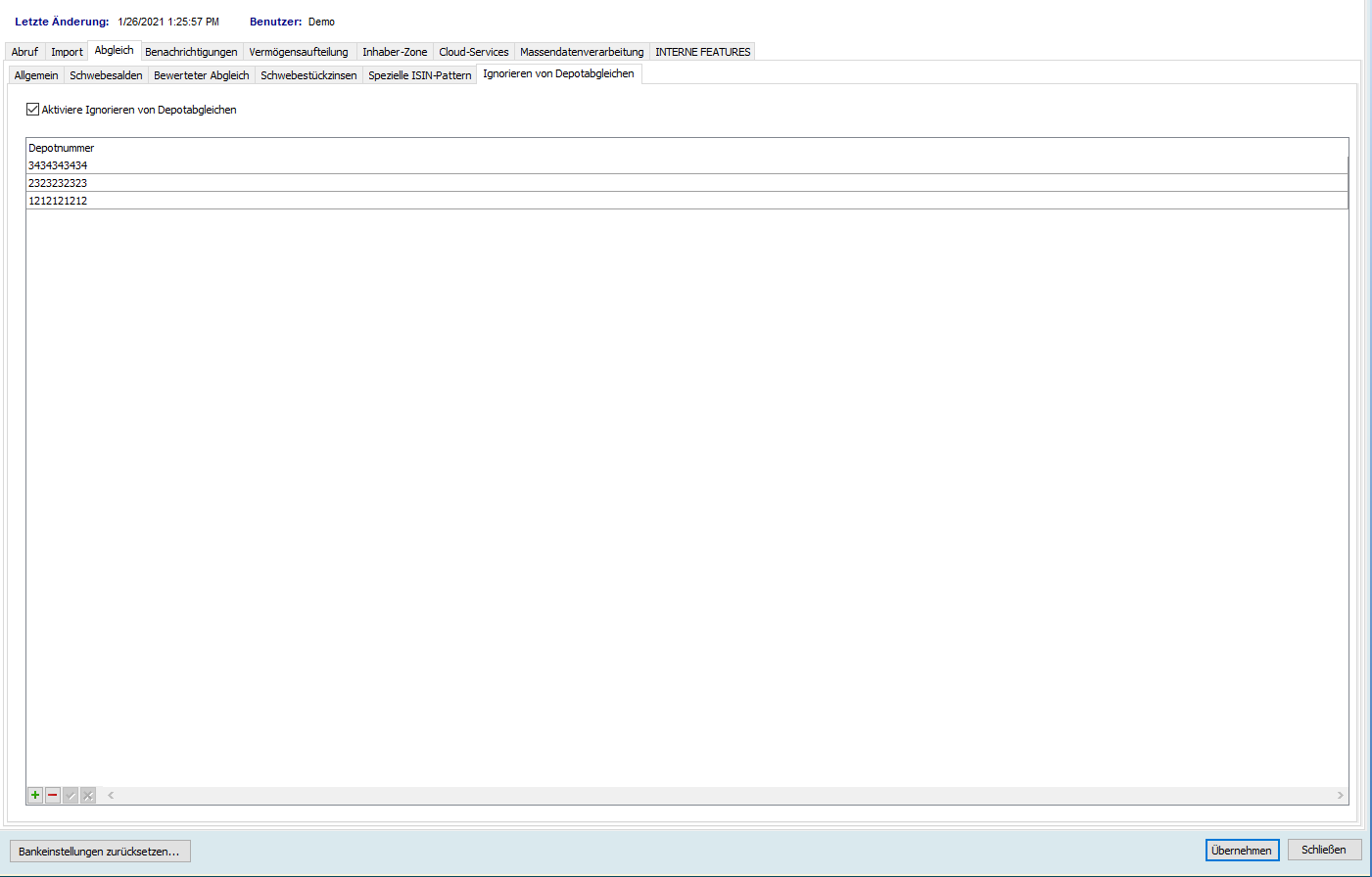 - Aktivieren Sie hier das Kontrollkästchen "Aktiviere Ignorieren von Depotabgleichen".