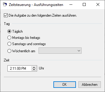 - Geben Sie im nun erscheinenden Dialogfenster der Zeitsteuerung die genauen Zeiten für die Ausführung der Aufgabe an und bestätigen Sie mit "OK".