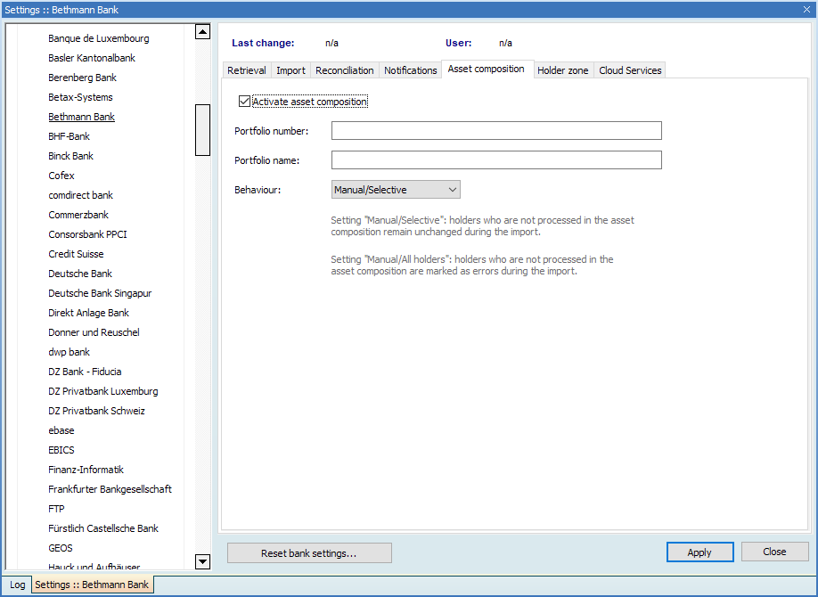 For more information on the formulas for the names and numbers of the portfolios, see Asset composition. - From the "Behaviour" drop-down list, select how you want to treat holders and their portfolios that are not managed via the asset composition.