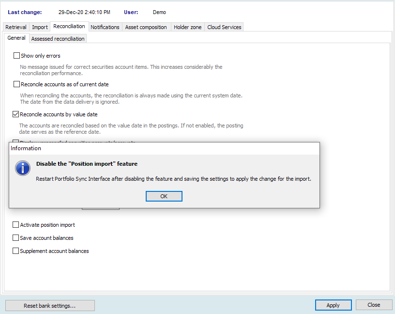 - In the settings of your bank, switch to the "Reconciliation" tab, and then the "General" tab.