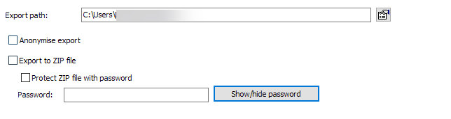 Anonymise export | Select this checkbox to export an anonymised file. In this case, the exported file is given the addition ".anonymized" in its name. Example "TestData.anonymized.zip" |