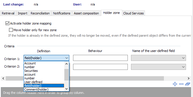 - Below, define the first criterion of the holder zone mapping. For this criterion, select the definition, the behaviour and the name of the user-defined field in the corresponding drop-down lists.