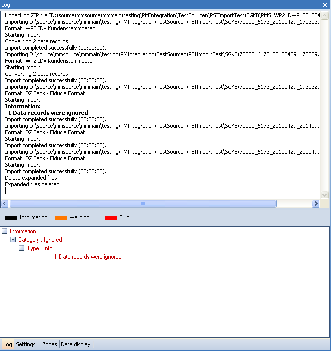 After retrieval or reconciliation, the log window is broken down into two parts. The bottom area of the log window provides the key information in compressed form.
