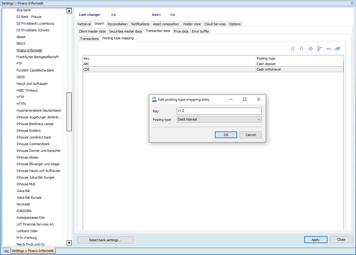 - In the "Bank" area on the left of the "Settings" window, click the corresponding bank.