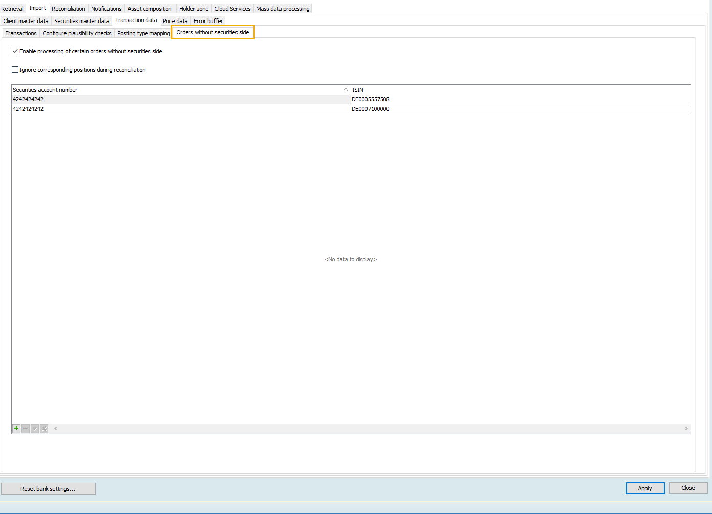 - In the bank-specific settings, switch to the tab "Import", "Transaction data", "Orders without securities side".