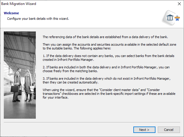 Start the Bank Migration Wizard by selecting DATA ENTRY, SUPPLEMENT BANKS FOR CLIENT MASTER DATA in the main menu of PSI. The first page of the Bank Migration Wizard welcomes you, providing introductory information.