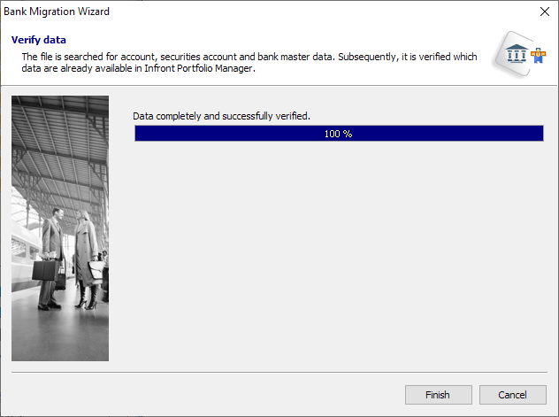 Click the "Next" button. This opens the next screen of the wizard. Here, the data contained in the file are checked (verified). The wizard searches for the account, securities account and bank master data. Next, the wizard checks which data is already contained in Infront Portfolio Manager. A status indicator shows the progress of the checking operation. The result of the check is displayed. In addition to providing the number accounts, securities accounts and banks found, the wizard also informs you about the number of fitting accounts and securities accounts in Infront Portfolio Manager. Click the "Next" button. This opens the next screen of the wizard. On the page, you see a list of the banks from the data delivery with information on name, sort code, BIC and branch. You can create them automatically in Infront Portfolio Manager. If necessary, filter the list from the data delivery by banks that you want to create in , because only the visible banks are created. Click the "Create banks" button to create the currently visible banks. Infront Portfolio ManagerIf you do not want to create banks from the list in Infront Portfolio Manager, select the "Do not create any" checkbox.