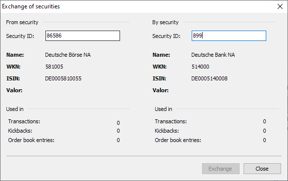 - If both of the securities to be exchanged are correct, start the exchange across the entire database by using the (now enabled) "Exchange" button.