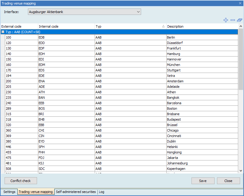 All trading venue mappings for this bank are displayed. The list is grouped by the "Type" column. Several types are possible per interface: The non-editable predefined assignments (for example, of the "XYZ bank" type) and the mappings possibly already created by it (of the "XYZ bank client" type).